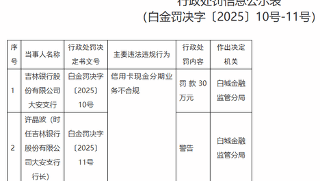 吉林银行大安支行违规被罚 信用卡现金分期业务不合规