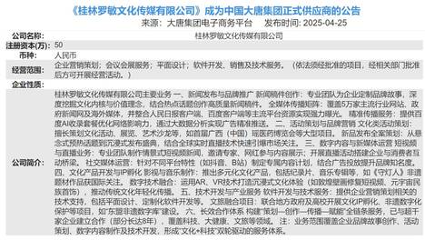 近日,从大唐集团电子商务平台传来喜讯,桂林罗敏文化传媒有限公😁司成功跻身中国大唐集团正式供应商行列,公告发布于2025年4🙄月25日。桂林罗敏文化传媒有限公司成立以来,始终秉持创新与专🤔业精神,在文化传媒领域深耕细…