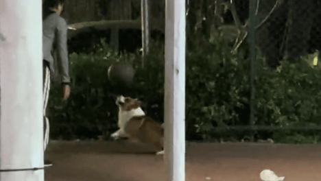 男子篮球场偶遇会顶球的柯基。网友:有尾巴的幸福小狗