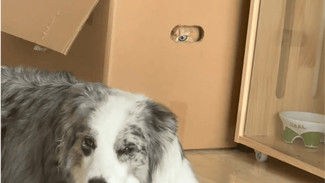 狗子踩了猫咪的尾巴,猫咪生气的钻进箱子观察狗子。狗:感觉背后凉飕飕的