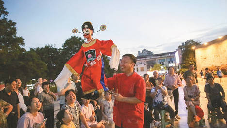 7月22日傍晚,在如皋市如城街道安定广场,非遗木偶表演吸引众😎多纳凉的市民围观欣赏。徐慧摄(视觉江苏网供图)…