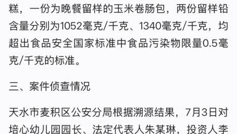 甘肃天水一幼儿园部分幼儿血铅异常事件,经调查,食品非法添加物😢为彩绘颜料。新华社兰州7月8日电8日上午,甘肃省天水市联合调👏查组公布了当地幼儿血铅异常事件的调查结果。经公安机关侦查,褐👍石培心幼儿园园长、法定代表人…