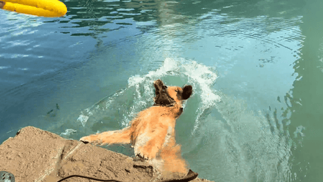 金毛鱼跃水面,男子笑得合不拢嘴,金毛模仿游泳动作,逗乐众人。😆