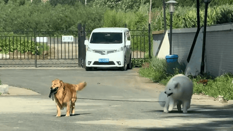 女子出门中途折返回家,看到偷溜出来的狗子们,边牧假装不认识主人,金毛遛萨摩耶
