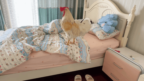 女子家养的搞笑公鸡,每天清晨准时打鸣,叫醒女子。女子被其行为😍逗乐,哭笑不得。