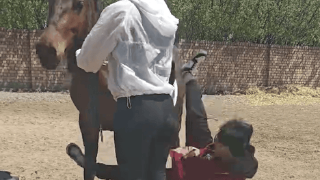 女子朋友第一次骑马,结果还没上马就给马来了一个滑铲。马:上来就给我一个下马威