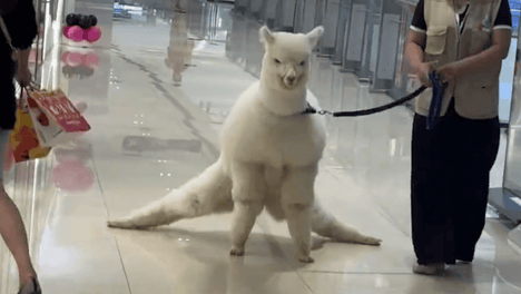 女子商场偶遇羊驼,羊驼脚滑导致后腿劈叉。网友:滑驼在世