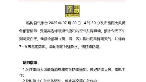 【临朐县气象局】【临朐县应急局】县气象台7月20日14时30😢分发布雷雨大风黄色预警信号:受副高边缘暖湿气流和冷空气共同影🤩响,预计今天下午到明天白天,临朐县全部镇(街、园、区)将出现😂雷阵雨天气,并伴有7~9级雷…